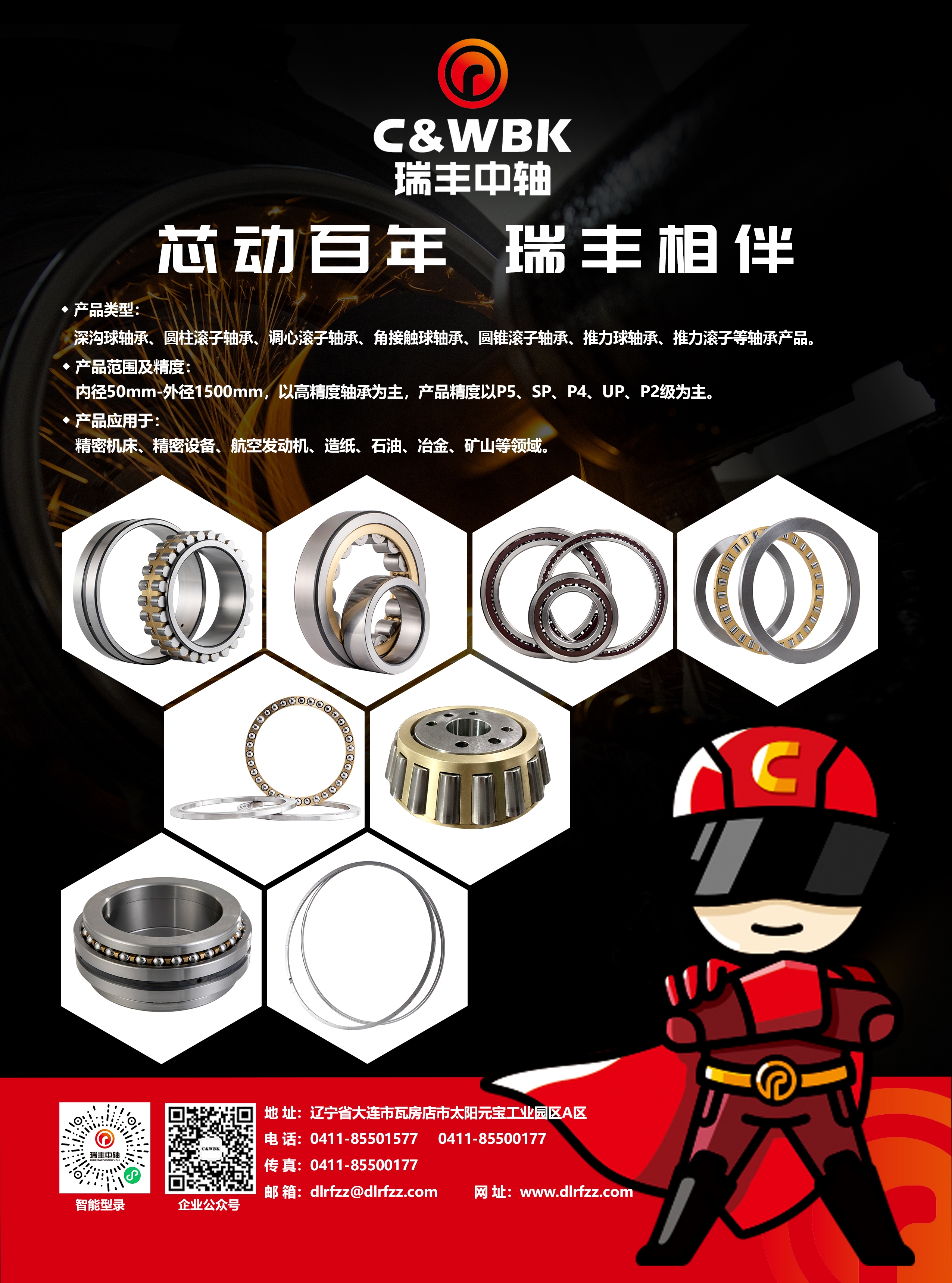 公司成立于2009年坐落于辽宁省瓦房店市太阳工业园区,公司是以轴承研发、设计、制造、销售为一体的生产型国家高新技术企业。工厂厂房面积约12500平方米,拥有国内外先进的专业生产设备及检测仪器155台/套,其中数控加工设备约占80%以上,年产量约12万套,产值1.5亿元; ● 产品类型: 深沟球、圆柱滚子、调心滚子、角接触球、圆锥滚子、推力球、推力滚子等轴承产品。 ● 产品范围及精度: 内径50mm-外径1500mm,以高精度轴承为主,产品精度以P5、SP、P4、UP、P2级为主 ● 产品应用于: 精密机床、精密设备、航空发动机、造纸、石油、冶金、矿山等领域。 公司拥有专业的研发科研团队,为客户提供售前评估,售中、售后技术支持,我公司“C&WBK”品牌轴承产品,以航空发动机轴承无限寿命设计和工艺为基础,为市场提供超高性价比产品和服务。为中国轴承发展竭尽全力。